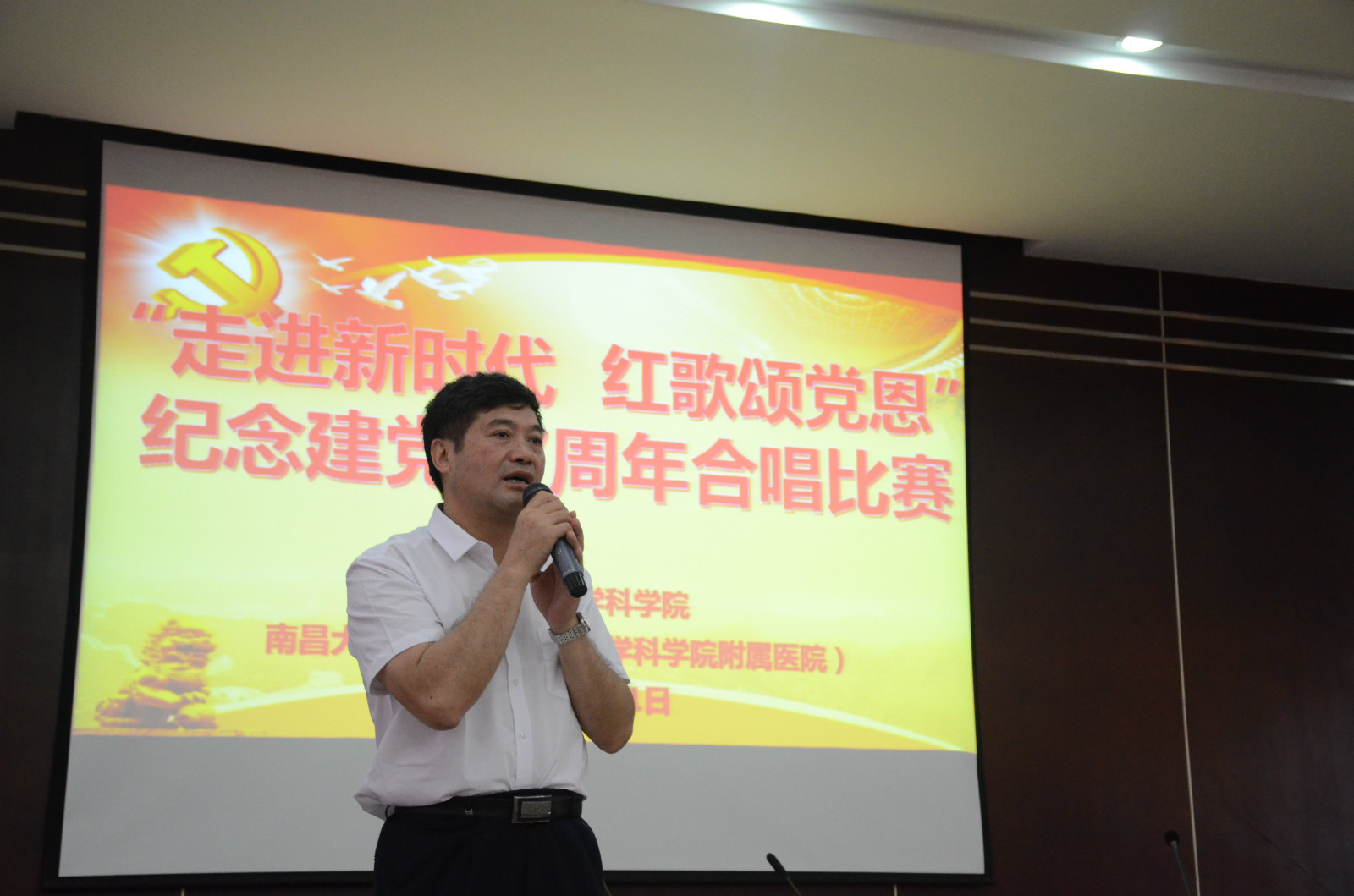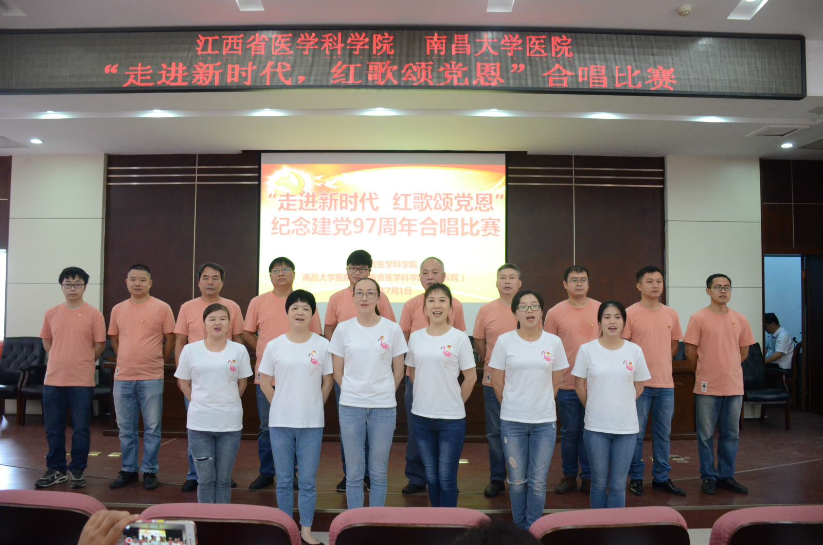 7月1日上午,嘹亮的歌声响南昌大学医学院图书馆会议室。由江西省医学科学院工会、南昌大学医院工会(以下简称两院工会)举办的纪念建党97周年合唱比赛隆重举行。